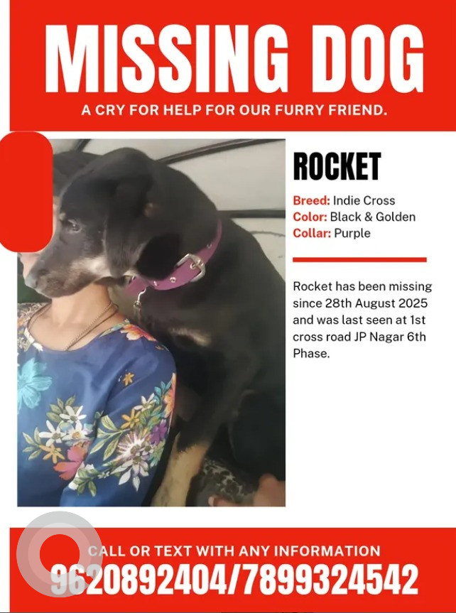 A Black and Brown Male Indie mix Dog Missing from Jarganahalli, JP Nagar Phase 6, 28, Kanakapura Rd, Jarganahalli, JP Nagar Phase 6, J. P. Nagar, Bengaluru, Karnataka, 560078, India on 2025-08-28. Dog name is Rocket and quick identifications are Purple Collar. If you have any information, please contact on information provided.