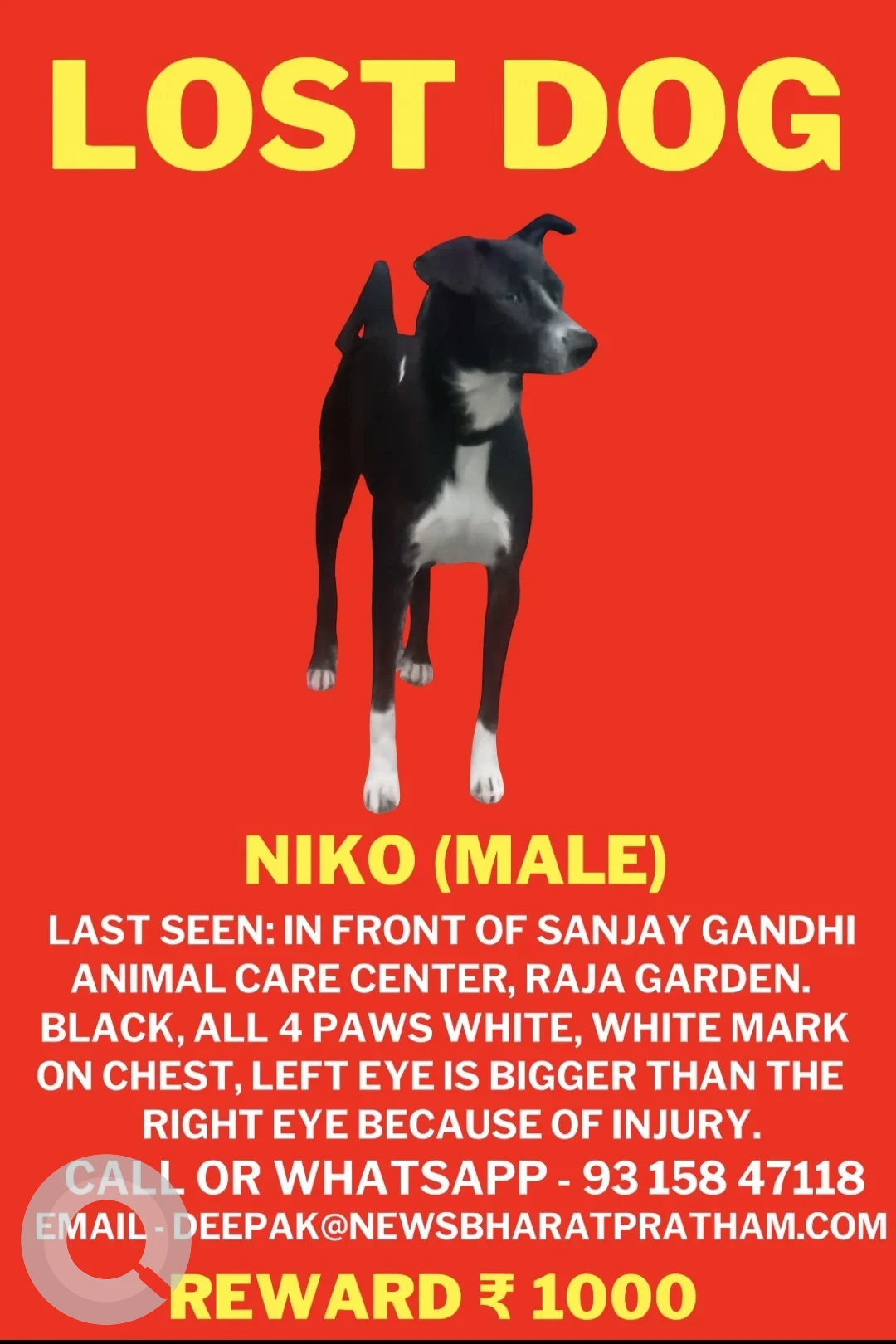 A Black and White Male Indian Dog Found from Sanjay Gandhi Animal Care Centre, Shivaji College Rd, Shivaji Enclave, Raja Garden, Delhi, 110027, India on 2025-11-14. Dog name is Niko and quick identifications are Left eye is slightly bigger than right due to an injury. If you have any information, please contact on information provided.