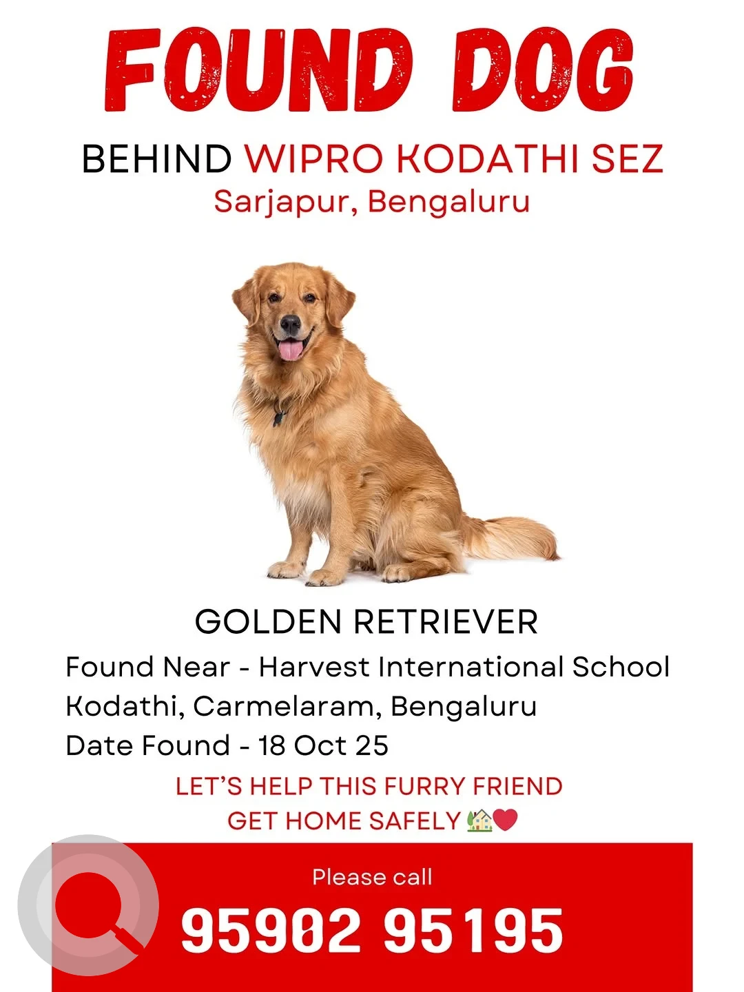 A Golden Male Golden Retriever Dog Found from Harvest International School, SY No 56/1B Off Sarjapur Road Near Sarjapur Kodathi Silk Farm, Carmelaram Post, Kodathi, Bengaluru, Karnataka, 560035, India on 2025-10-18. Dog name is Not available and quick identifications are Not available. If you have any information, please contact on information provided.