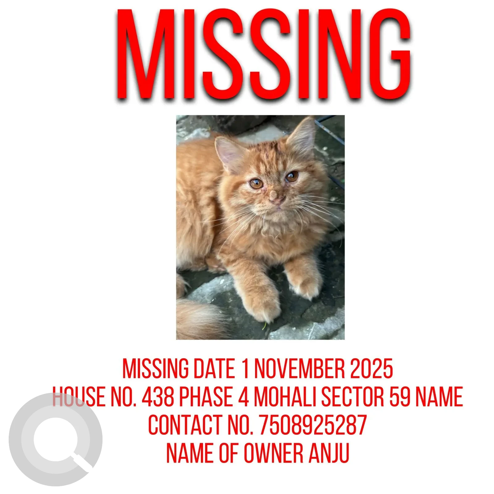 A Golden Male Persian Cat Missing from 145, Sector 59, Phase 4, Mohali, 145, Sector 59, Phase 4, Mohali, 145, Mohali Stadium Rd, Phase 4, Sector 59, Sahibzada Ajit Singh Nagar, Punjab, 160059, India on 2025-11-01. Cat name is Brownie and quick identifications are Hair spot on nose 6 month. If you have any information, please contact on information provided.