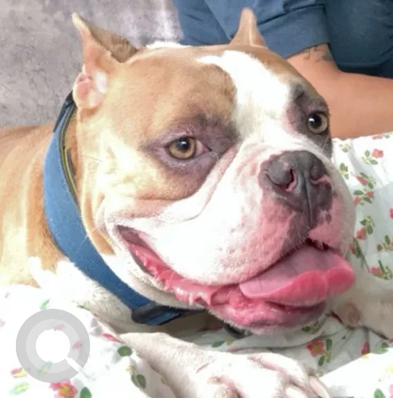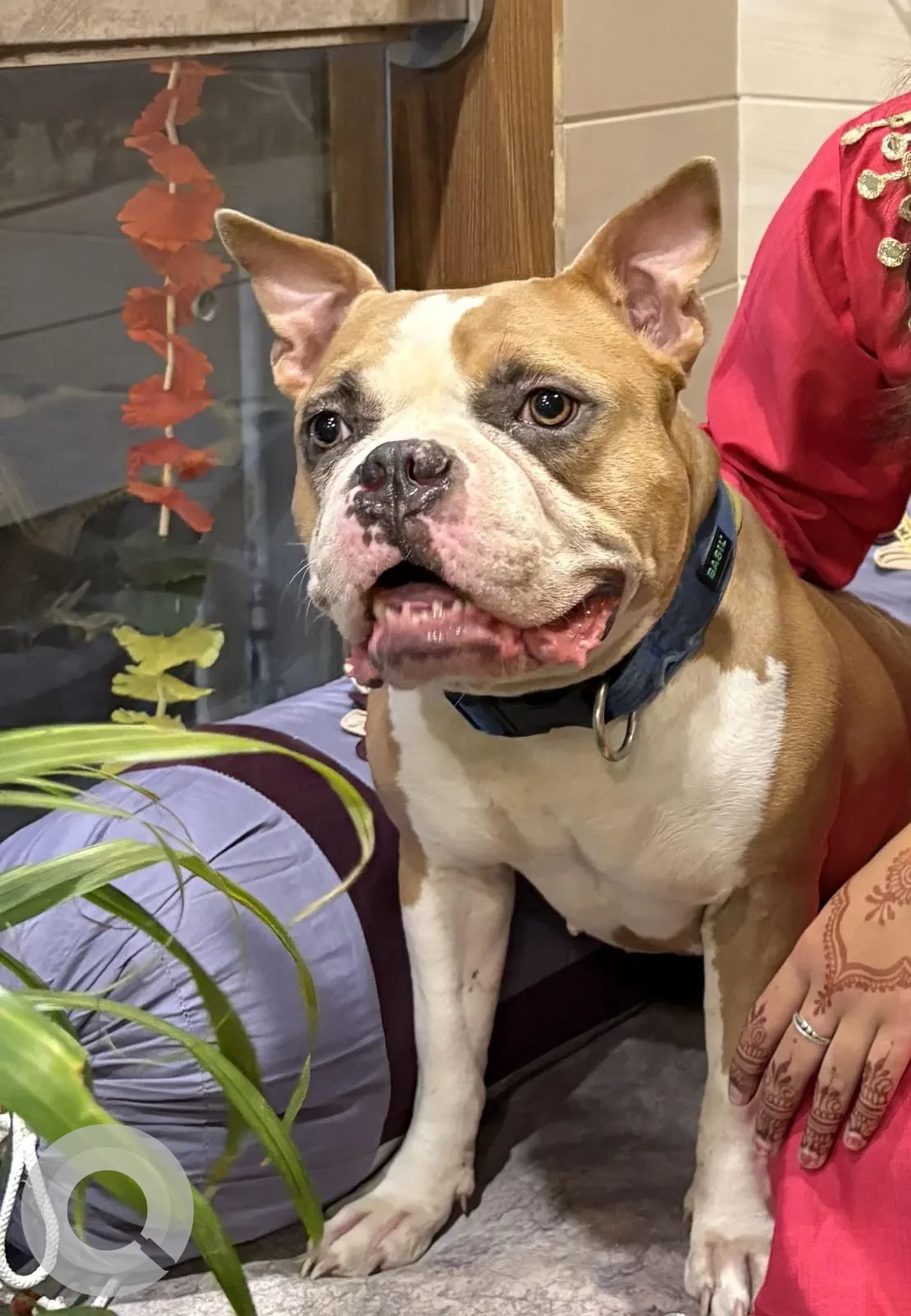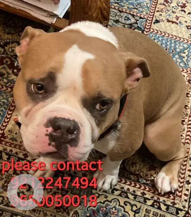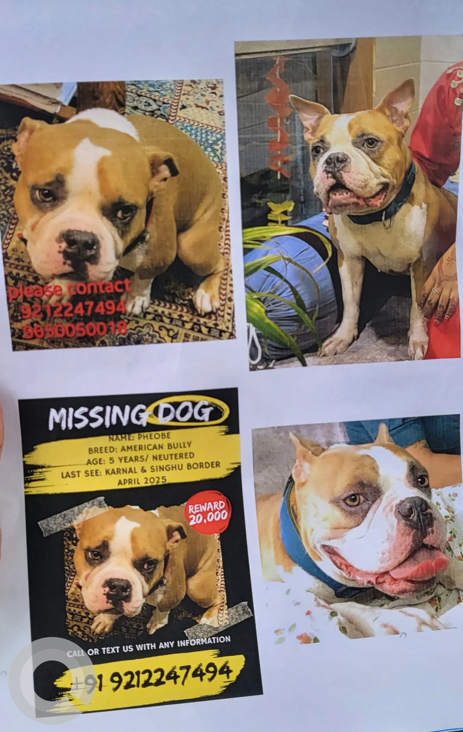 A Light Brown Female American bully Dog Missing from Singhu Border GT Road, Singhu, Delhi, 110036, India on 2025-04-08. Dog name is Phoebe and quick identifications are White patches on head, neck, paws and chest surgery mark on the abdomen. If you have any information, please contact on information provided.