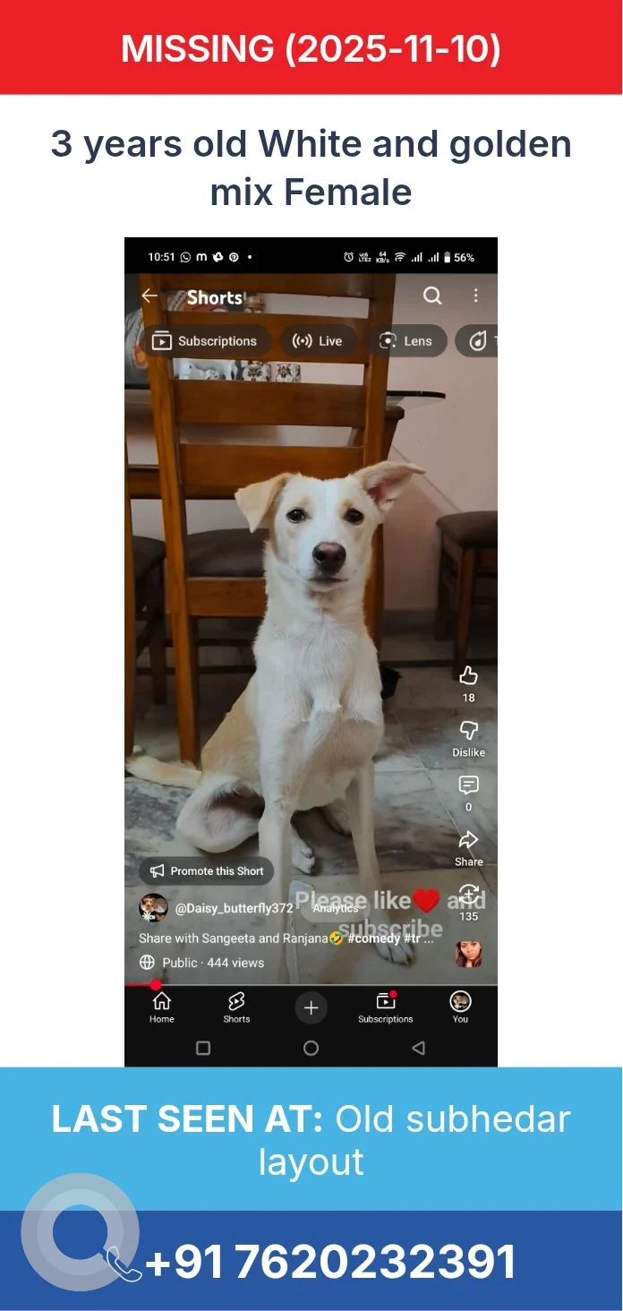 A Other Female Indie Dog Missing from 149, Old Subhedar Layout Main Rd, Old Subhedar Layout, Jawahar Nagar, Ayodhya Nagar, Nagpur, Maharashtra, 440024, India on 2025-11-10. Dog name is Daisy and quick identifications are One ear is tilt other is straight. If you have any information, please contact on information provided.