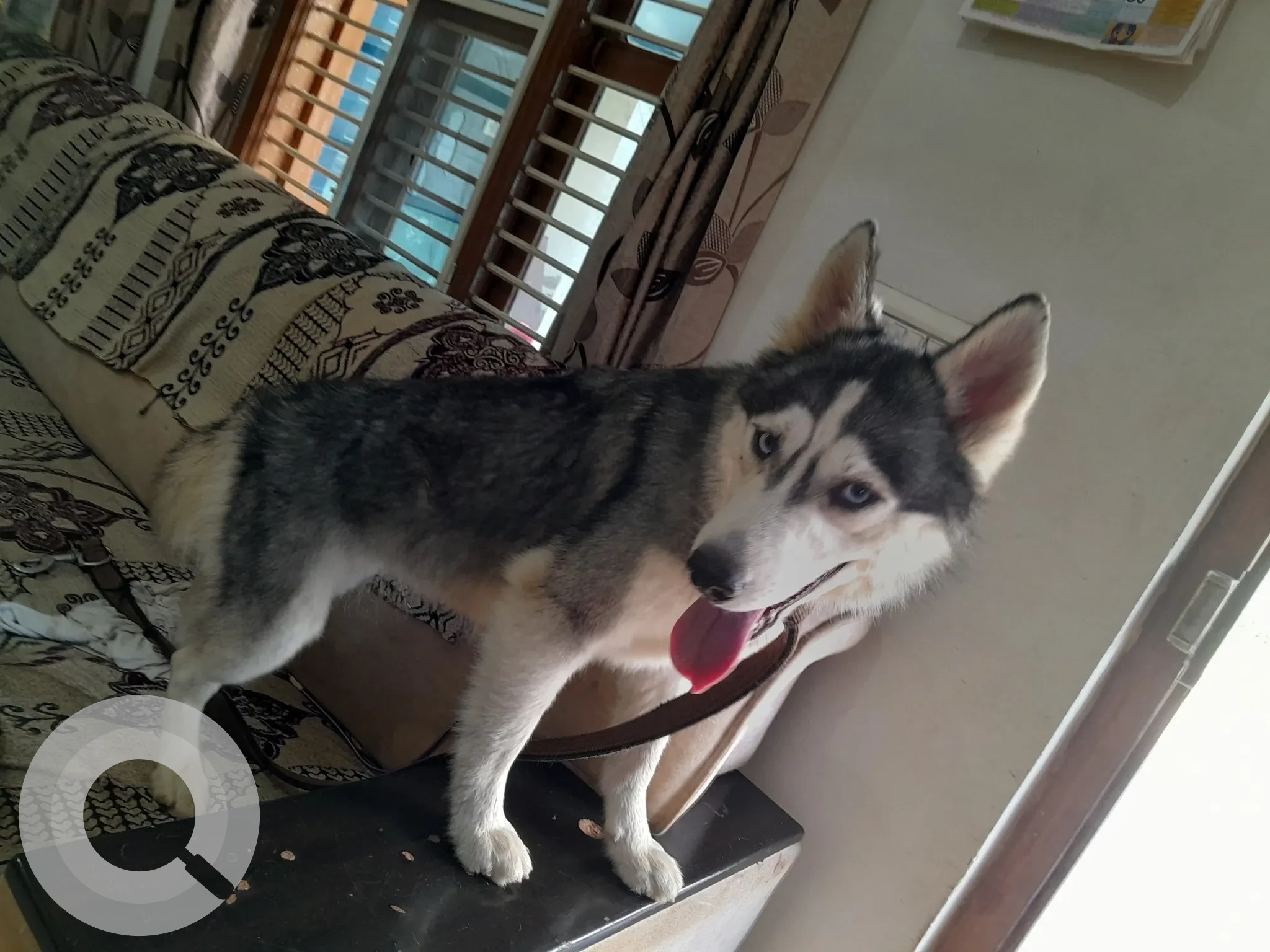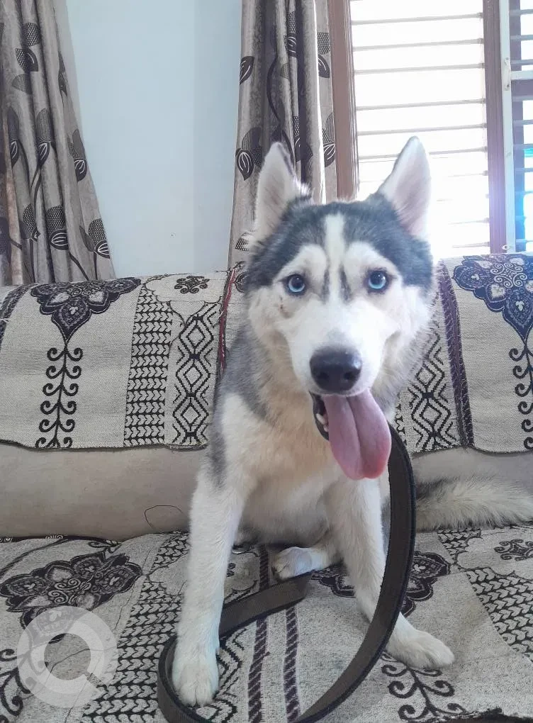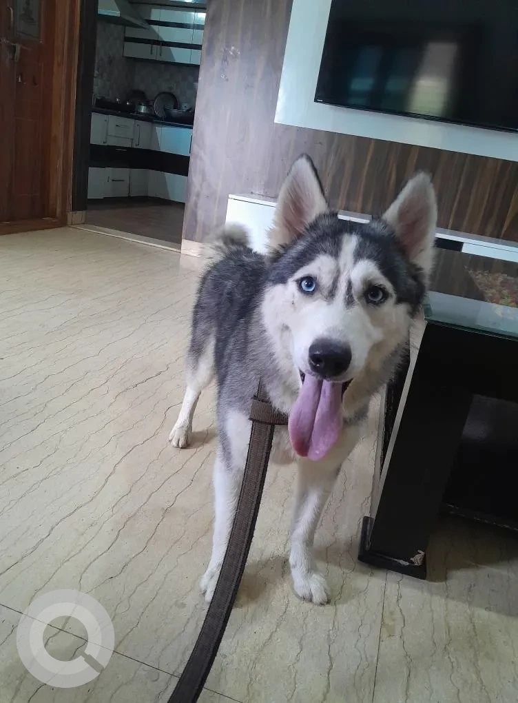 A White and Grey Male Siberian Husky Dog Found from Bagaluru Cross BusStop, Unnamed Road, Vinayak Nagar, Yelahanka, Bengaluru, Karnataka, 560063, India on 2025-08-29. Dog name is Not Available and quick identifications are Eyes Bright Blue, mark near the left eye. If you have any information, please contact on information provided.