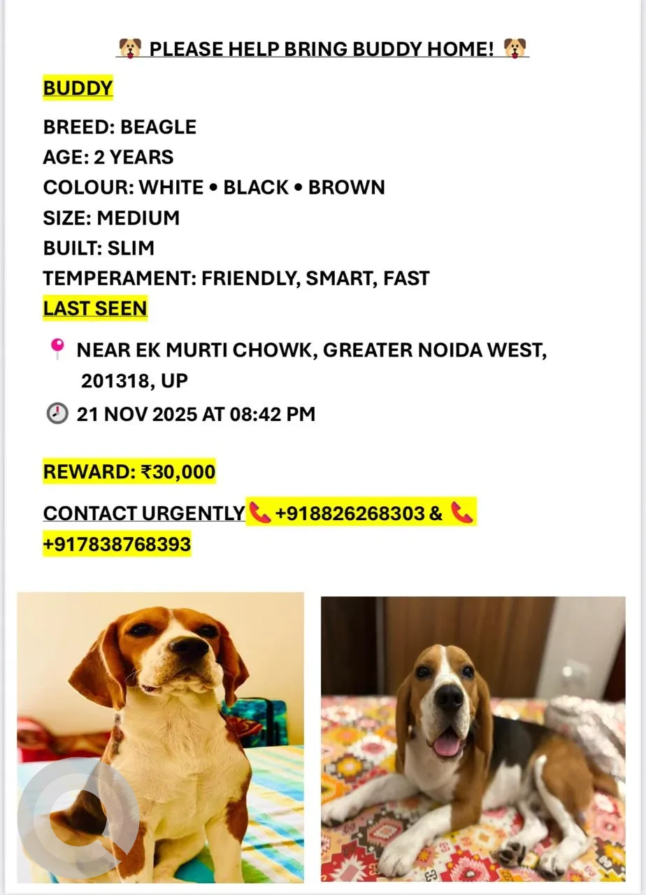 A White-Brown Mix Male Beagle Dog Missing from Ek Murti Chowk Noida Extension, Sector 17A, Gautam Buddha Nagar, Uttar Pradesh, 203201, India on 2025-11-21. Dog name is Buddy and quick identifications are Not available. If you have any information, please contact on information provided.