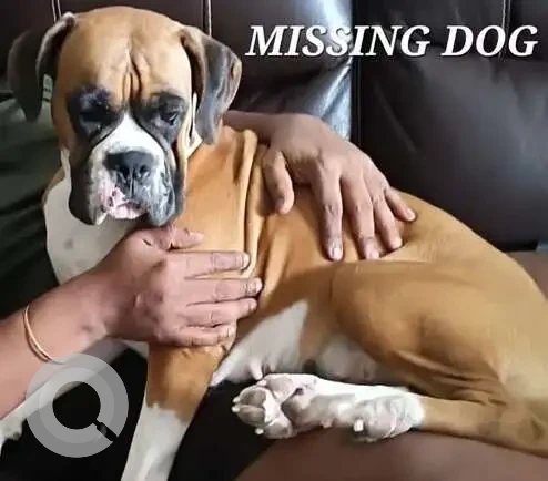 A White-Brown Mix Male Boxer Dog Missing from Hill County, Nizampet, Hyderabad, Telangana, 500090, India on 2025-10-23. Dog name is Cookie and quick identifications are Not available. If you have any information, please contact on information provided.