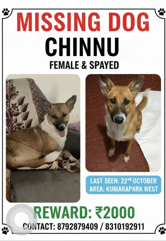 A White-Brown Mix Female Indian Street dog Dog Missing from Kumarapark West, Seshadripuram, Bengaluru, Karnataka, 560020, India on 2025-10-22. Dog name is Chinnu and quick identifications are Not available. If you have any information, please contact on information provided.