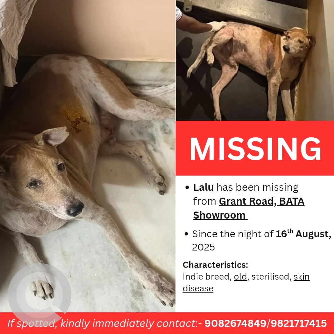 A White-Brown Mix Male Indie Dog Missing from Dr .Bhadkamkar Road Junction / Novelty, Krishna Kunj, Grant Road East, Bharat Nagar, Grant Road, Mumbai, Maharashtra, 400007, India on 2025-08-16. Dog name is Lalu and quick identifications are Skin Diseas. If you have any information, please contact on information provided.