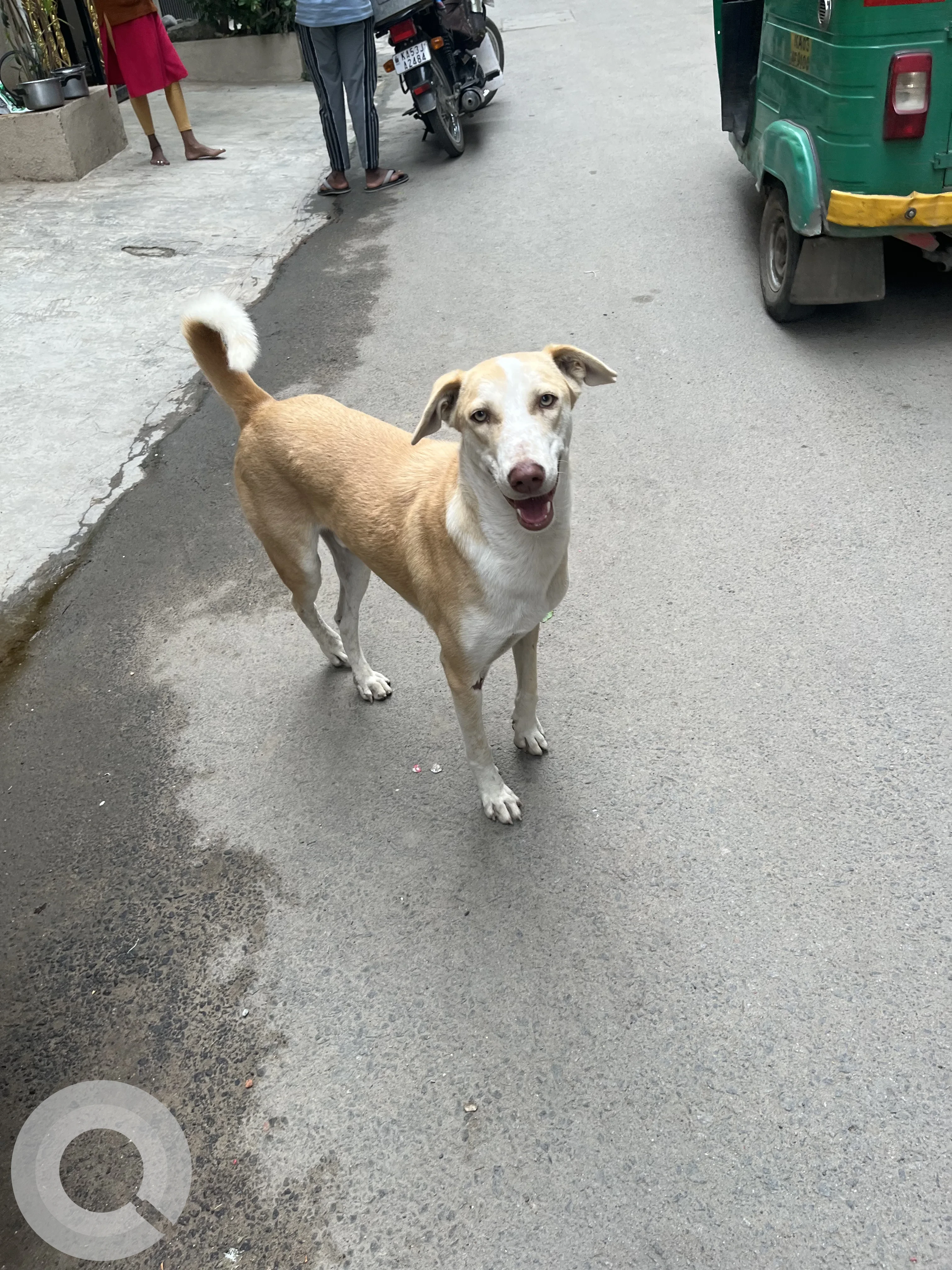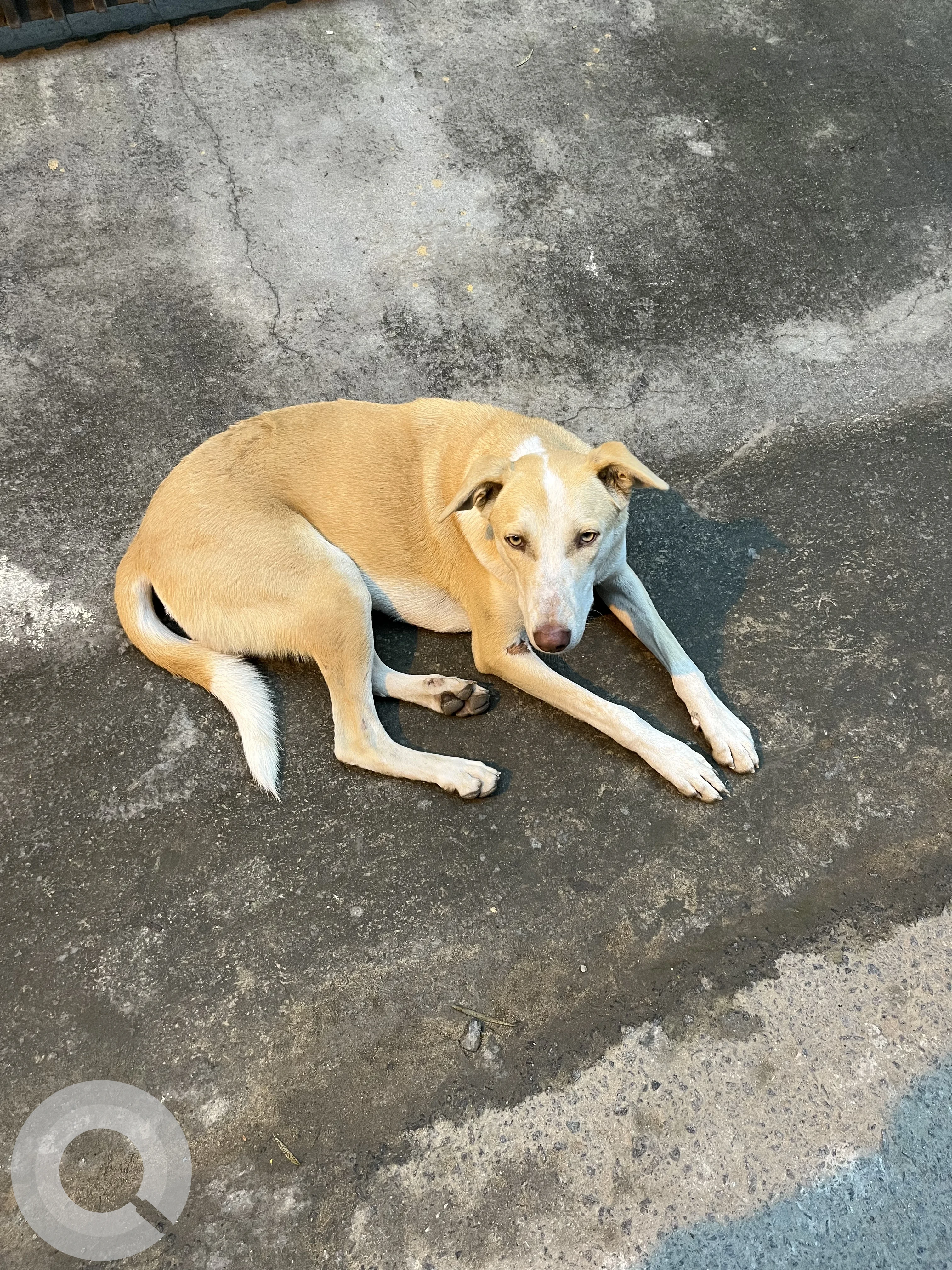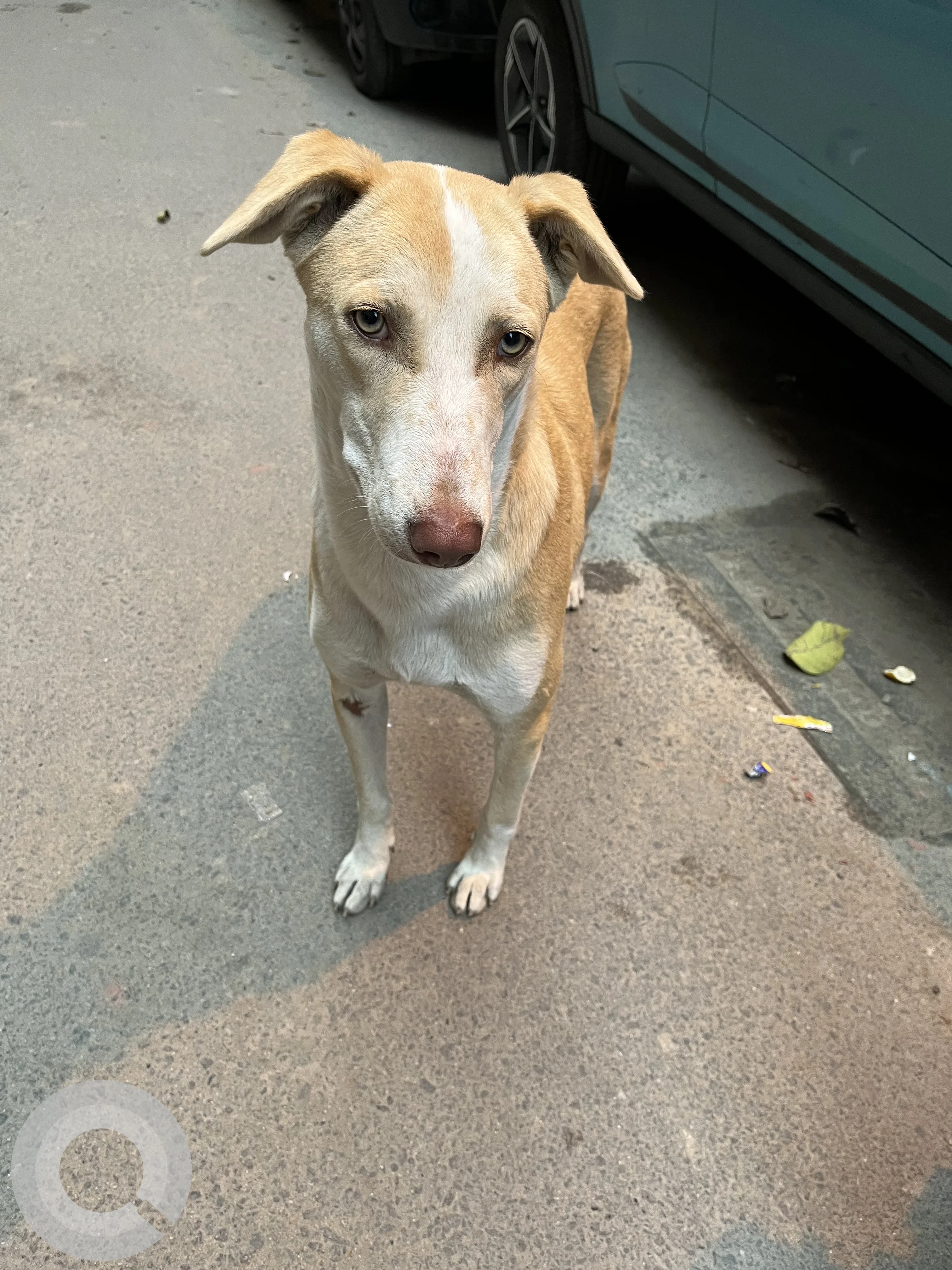 A White-Brown Mix Male Indie Mix Dog Found from Airview Apartments, 3rd Cross Rd, Air View Colony, HAL, Bengaluru, Karnataka, 560017, India on 2025-11-27. Dog name is Not available and quick identifications are Not available. If you have any information, please contact on information provided.