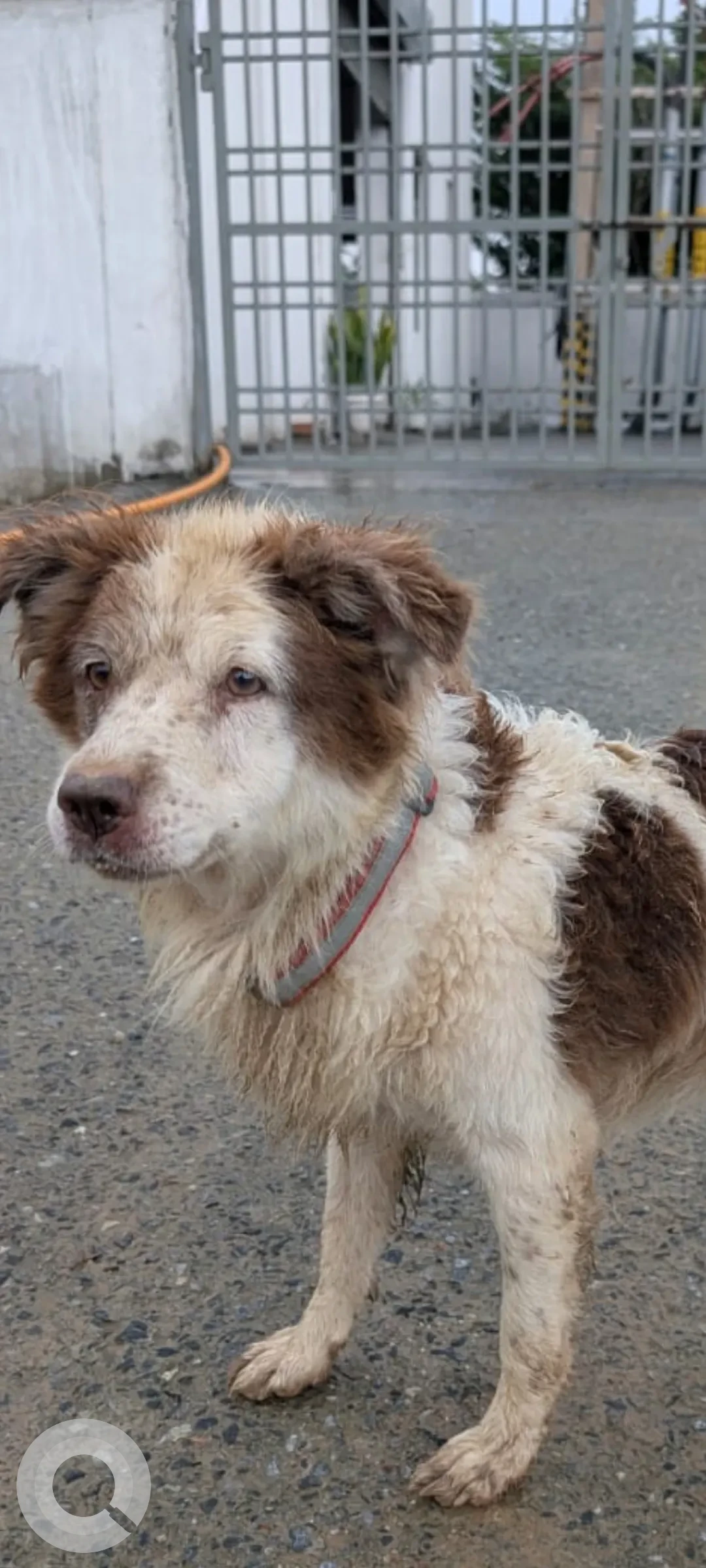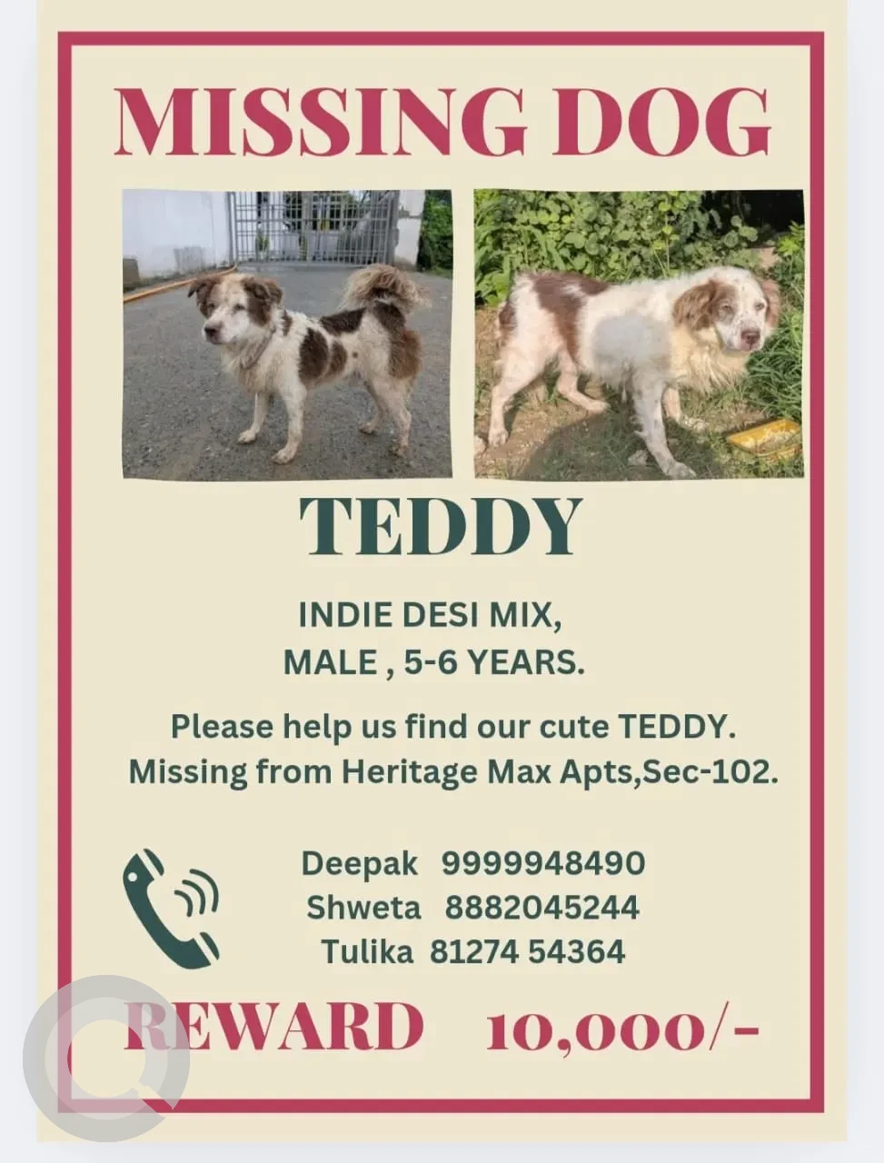 A White-Brown Mix Male Mixed breed Dog Missing from Heritage Max, Dwarka Expy, Sector 102, Gurugram, Haryana, 122006, India on 2025-10-18. Dog name is Teddy and quick identifications are Small size dog with brown eyes wearing reflective collar.. If you have any information, please contact on information provided.