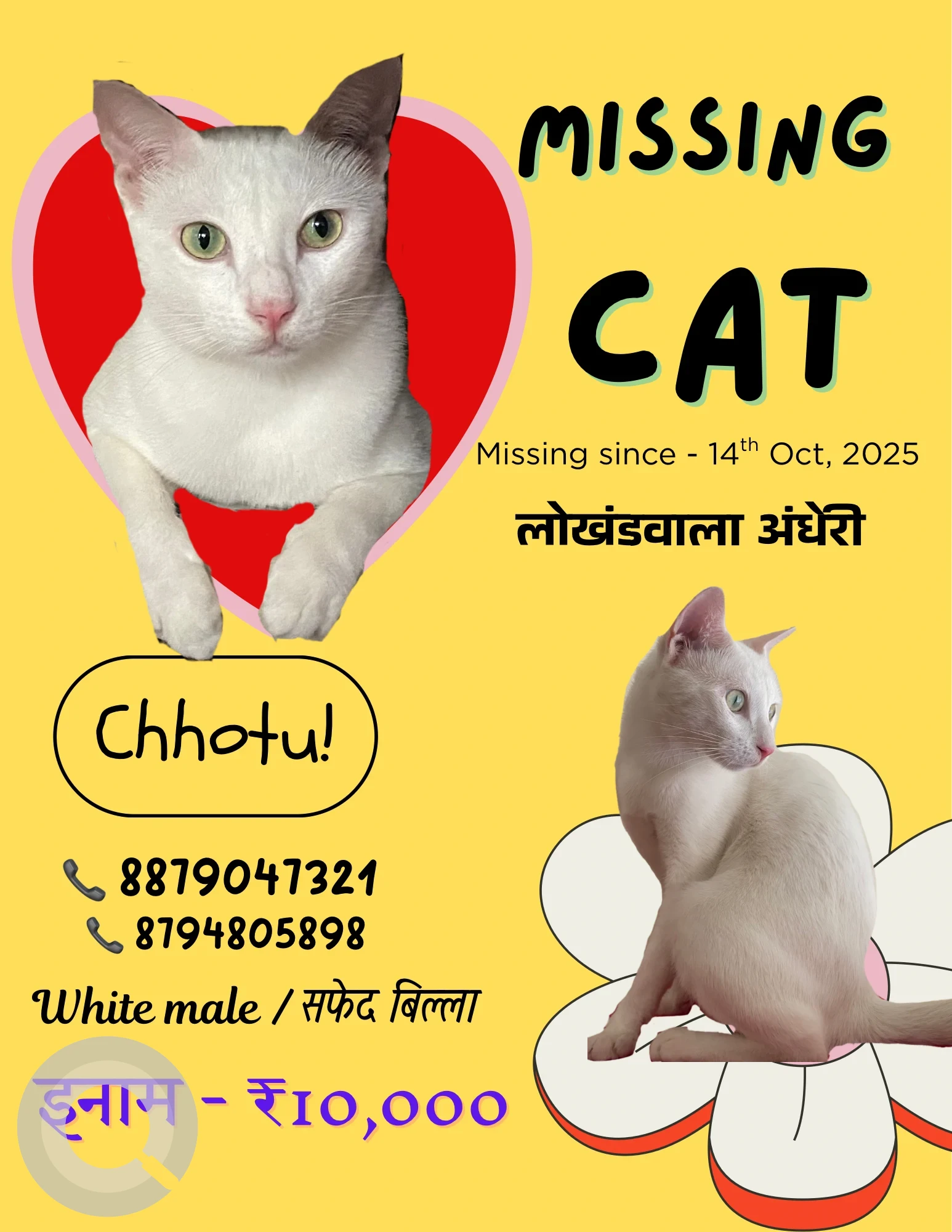 A White Male Indie Cat Missing from Lokhandwala Complex, Andheri West, Mumbai, Maharashtra, 400053, India on 2025-10-18. Cat name is Chhotu and quick identifications are Right eyelid torn hind leg missing paw. If you have any information, please contact on information provided.
