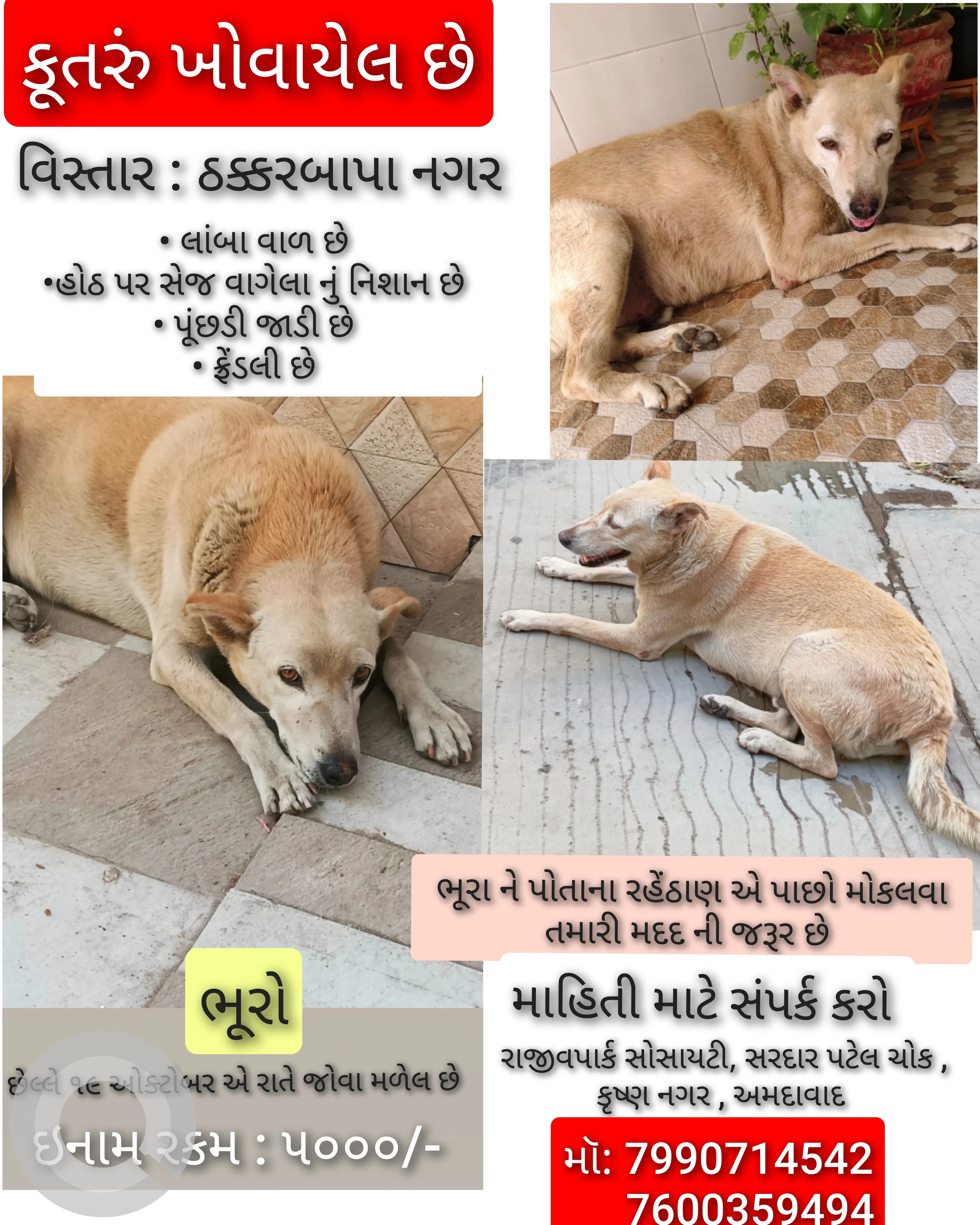 A White Male Indie Dog Missing from Krishna Park Society, Sardar Chowk, KrishnaNagar, Ahmedabad, Shyampark Society, Near, Sardar Chowk, Shyampark Society, KrishnaNagar, Ahmedabad, Gujarat, 382345, India on 2025-10-24. Dog name is Bhura and quick identifications are Mark on right lip and cut on right ear. If you have any information, please contact on information provided.