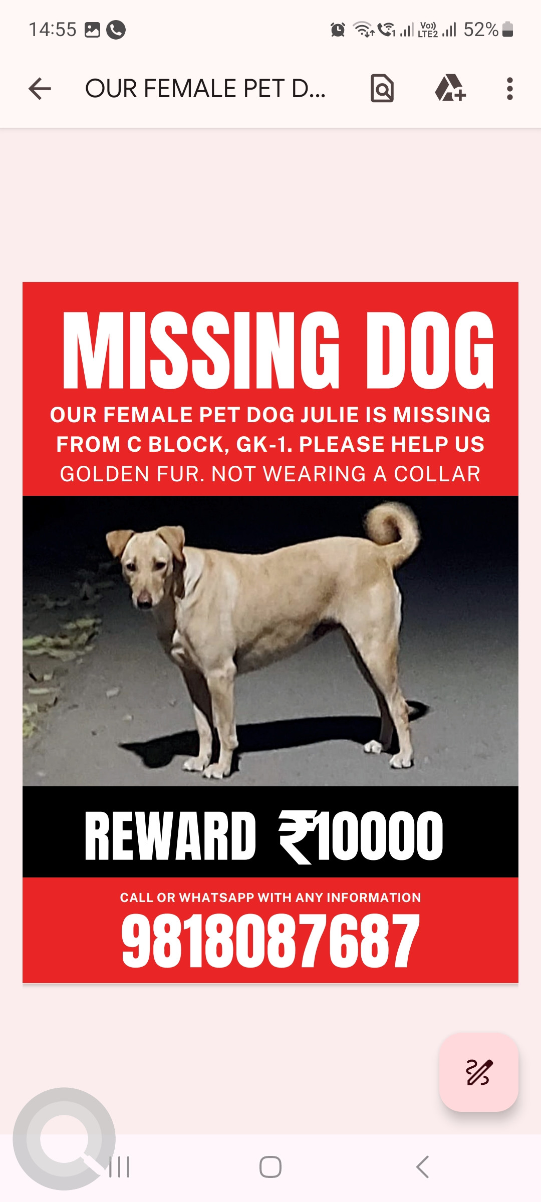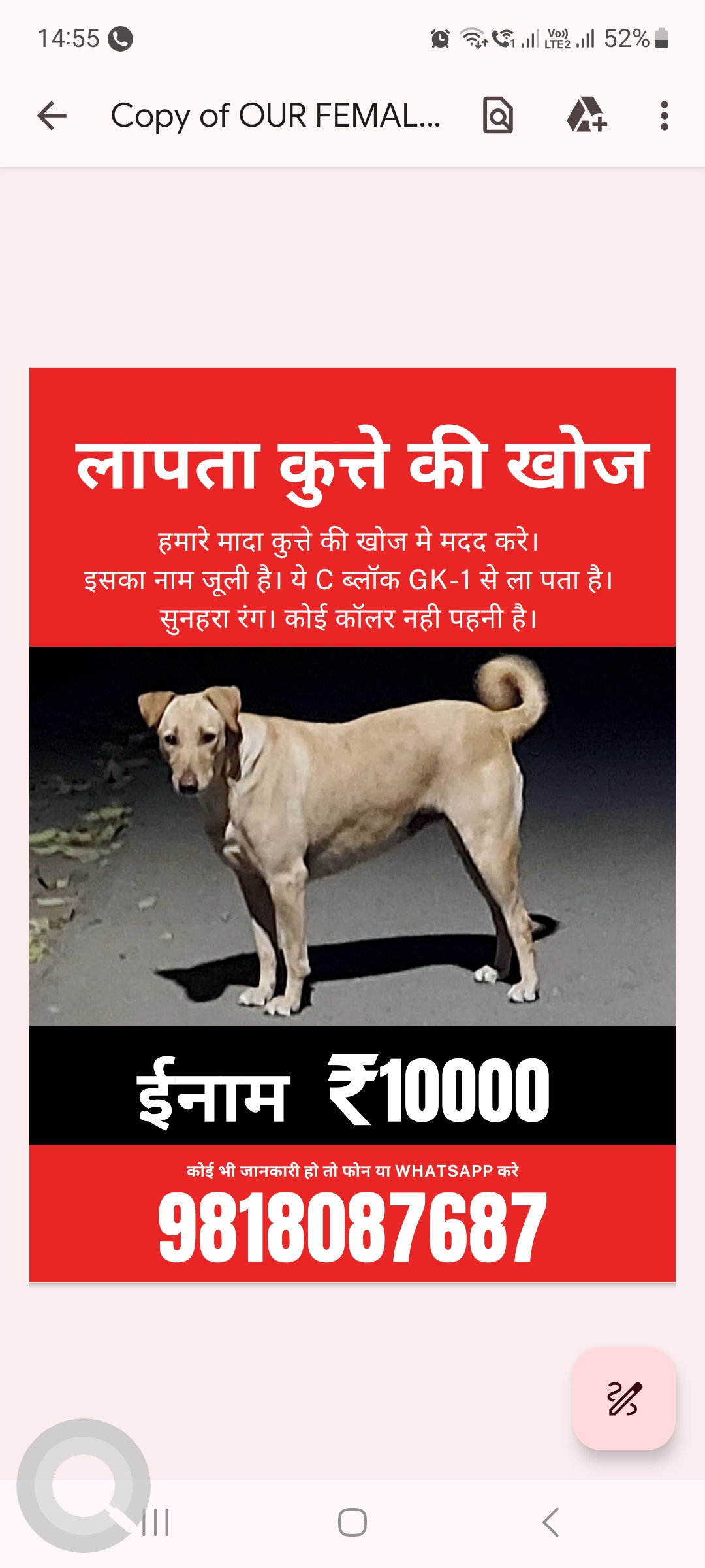 Golden Female Desi Dog is Missing from Greater kailash 1