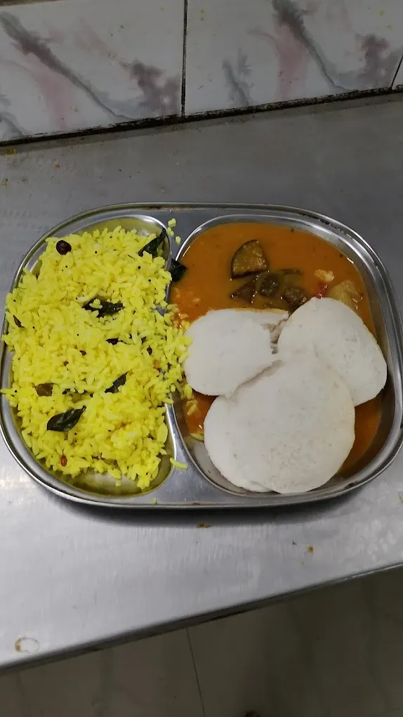 The food includes everyday staples like idli, pongal, sambar rice and curd rice, often served with a small portion of poriyal (vegetable stir-fry).